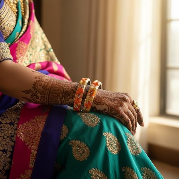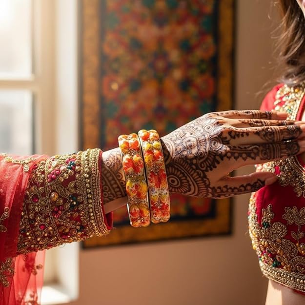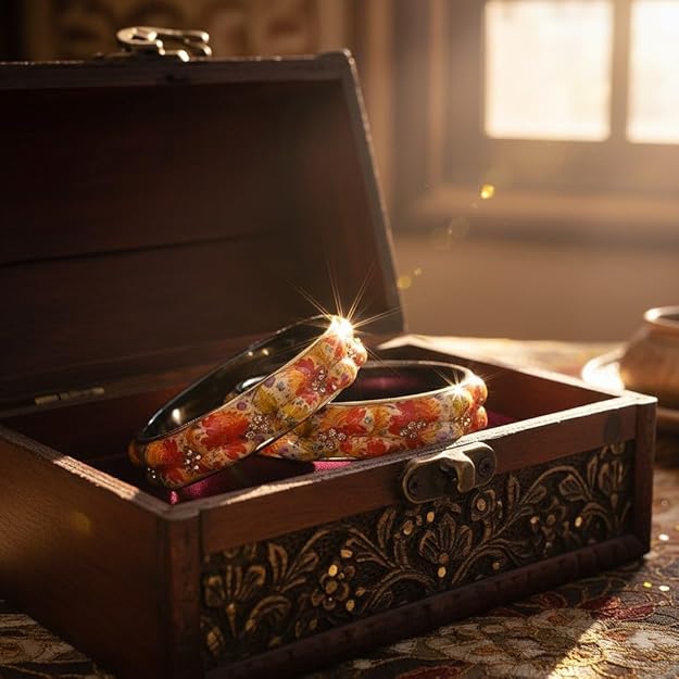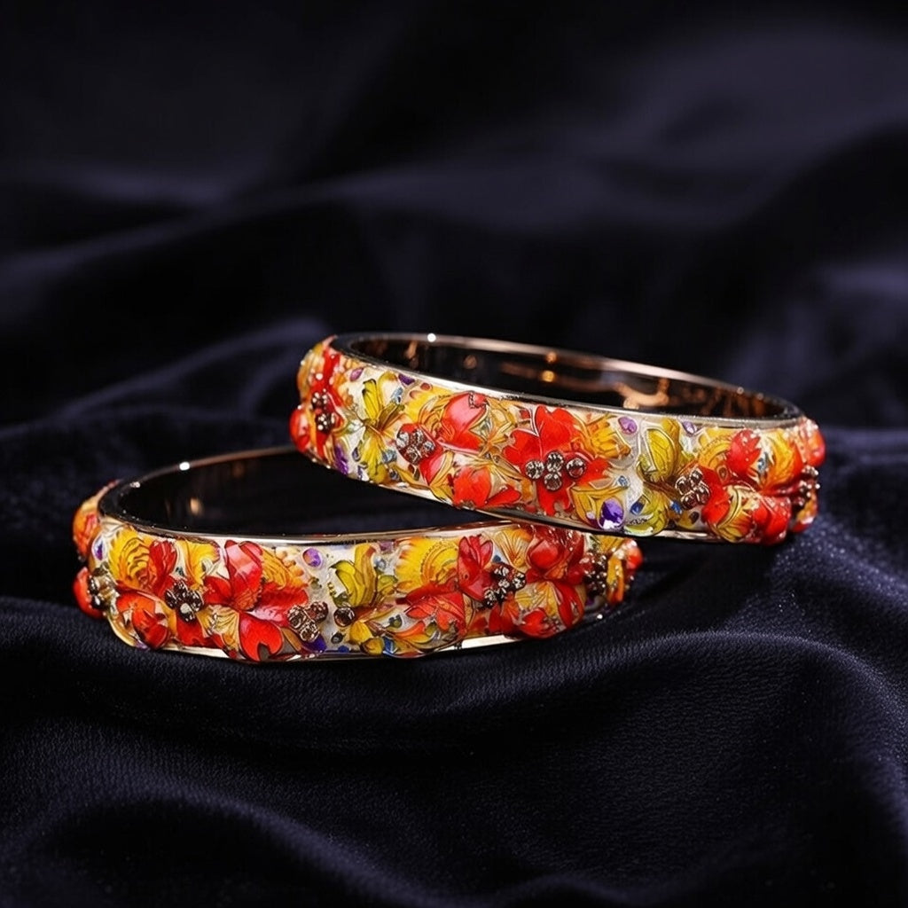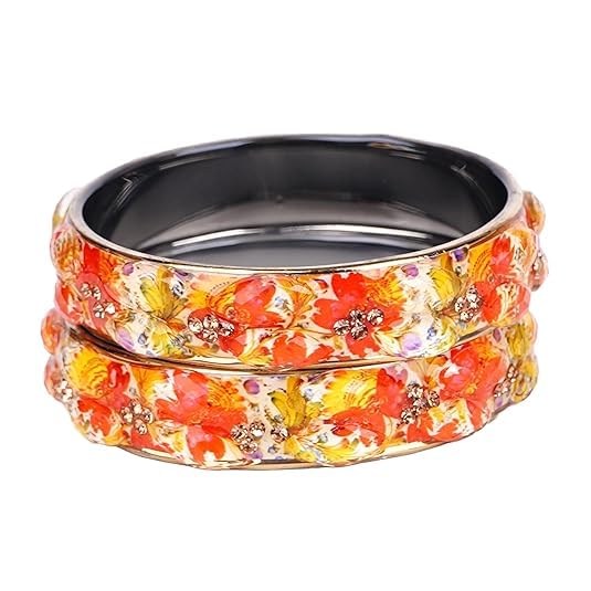 Add a splash of color and charm to your everyday look with the SAMYA BY SAMISHTHA Bangles, designed for women and girls who love effortless elegance. These bangles feature a striking floral pattern in vivid shades of red, orange, yellow, and purple, set against a glossy black base. Accented with sparkling embellishments and scalloped edges, they offer both comfort and durability - perfect for regular styling without compromising on beauty.