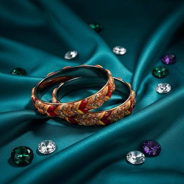 Add a regal touch to your ethnic ensemble with the SAMYA BY SAMISHTHA Vibrant Multi-Colour Glass Bangles Set. Handcrafted with precision, these bangles feature a rich blend of red, gold, and multicolored accents in geometric and floral motifs. The smooth glass surface, brass screw barrel clasp, and decorative stones make this set a perfect fusion of tradition and elegance—ideal for pairing with sarees, lehengas, and festive attire.